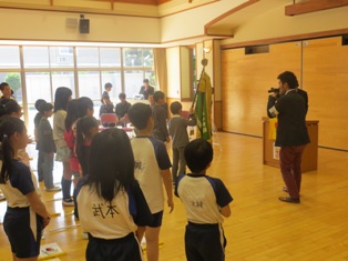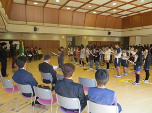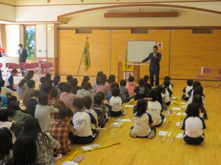 五個荘交通少年団入団式をふれあい広場で行いました。商工会の方々や市役所や警察署の方々にお越しいただき、新団員となった地区長・登校班長にむけてお話をしていただきました。