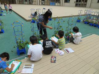 4月末に種をまいてから、ずいぶんと大きく成長してきたアサガオ。子どもたちは、成長のようすをスケッチしたり簡単なコメントをつけたりしてまとめています。これからは、美しい花が咲くようすを観察していきます。