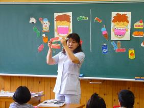 東近江市の歯科衛生士の方に来校いただき、歯磨きの仕方について