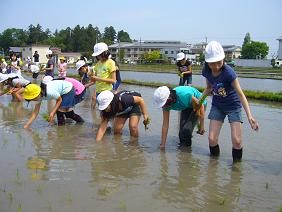 5年生では、地域の方に田んぼをお借りして「田植え」を行いました。