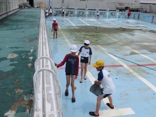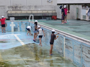 6月から始まる水泳学習を前に、6年生児童がプール掃除に取り組みました。全校のみんなが気持よくプールを使えるようにとプールの中、プールサイド、更衣室、トイレなどの掃除に一生懸命取り組みました。