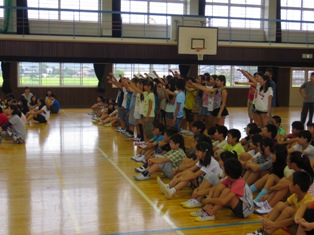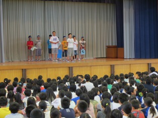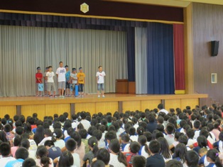 運動会に向けて、企画委員会から運動会スローガンが発表されました。今年のスローガンは「一人ひとりが あきらめない心を 輝かせよう!」です。また、各色応援リーダーが前に出て6年児童とともに、全校児童に運動会にむけての意気込みを発表しました。