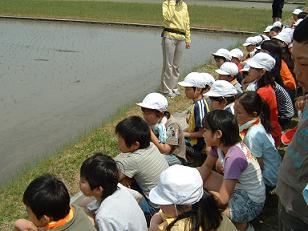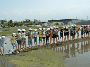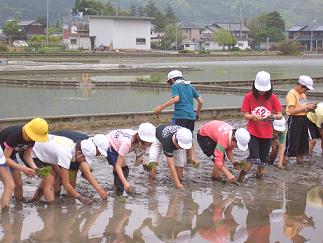 5年の総合学習で、田植えを体験しました。農業体験と地域伝統食について学ぶことをねらいとしています。これから、植えた苗が大きく育っていく様子を観察していきます。