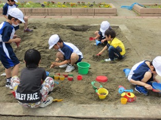 昨年度新設していただいた砂場を使って、子どもたちは楽しく遊んでいます。みんなで一緒に仲良く遊ぶことの大切さや後片付け、譲り合いといったことを学べる場でもあってほしいです。