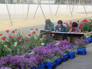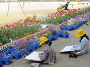 きれいなお花が咲いている花壇を題材に、スケッチに取り組みました。みんなじっくりと観察して一生懸命に取り組んでいました。