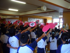 3年生から6年生で色別の応援練習をしました。