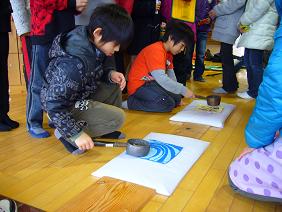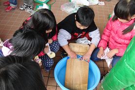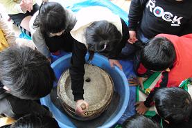 七輪でおもちを焼いたり、石臼できな粉を作ったりしました。子どもたちは、