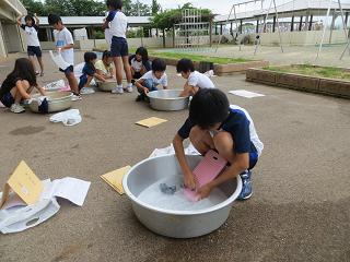 家庭科の学習で、自分が身につけていた靴下や体操服などを自分の手で洗う実習を行いました。使い慣れていない洗濯板を次第にうまく利用しながら、美しく洗い上げていくことができました。