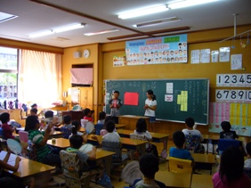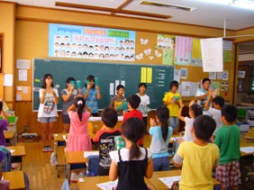 6年生の子どもたちが、各教室へ行って、応援の仕方を伝授しています。