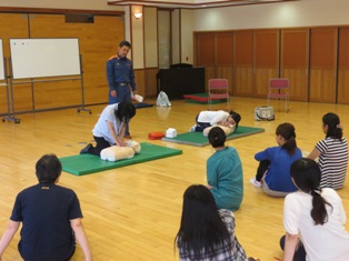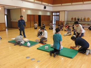 水泳学習前に、職員を対象に救命法講習会を行いました。消防署員の方をお招きして、心肺蘇生法、AEDの使用方法について詳しく教えていただきました。