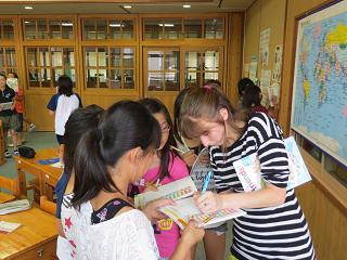 高学年では、ALTの先生とともに外国語活動に取り組んでいます。この日は、音楽に合わせて英語になじむ活動や誕生日を英語で聞きにまわる学習などをしました。