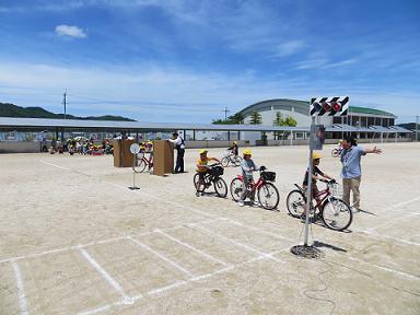 運動場で交番のおまわりさんや市の職員の方に来ていただいて学習しました。道の歩き方や自転車の乗り方について丁寧に教えていただきました。