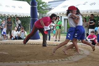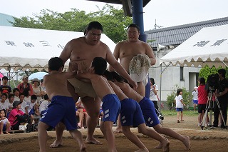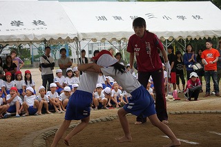 特に指導相撲では、高崎親方の進行の下、力士さんとの対戦では、どの子も力いっぱい向かっていきました。三人四人で大きなおすもうさんを土俵の外に押し出すことができたときには、体いっぱい喜びを表現していました。