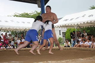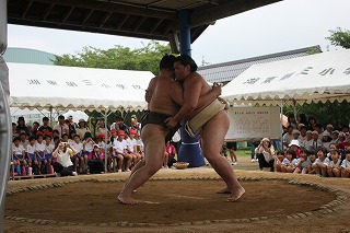 今年の相撲大会では、大相撲出羽の海部屋から高崎親方(元前頭金開山)・御 嶽 海(十両)碧 の 正(幕下)3名の方をお招きして、指導相撲や模範相撲を見せて頂くことができました。