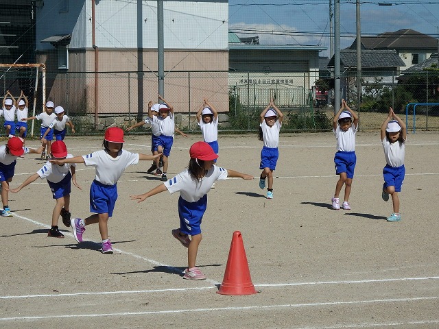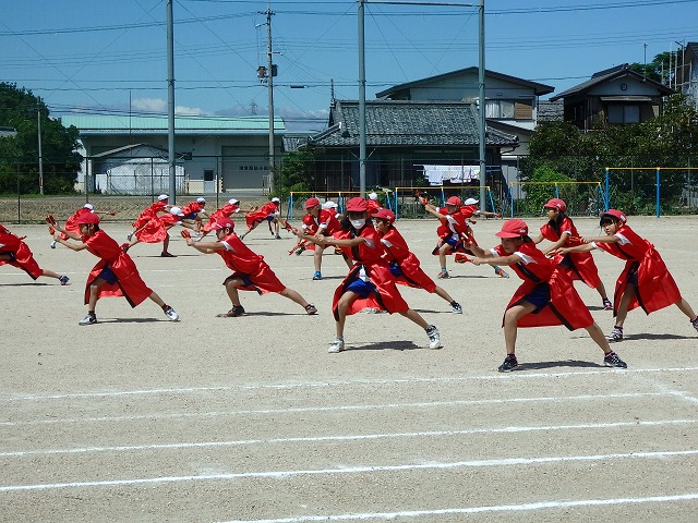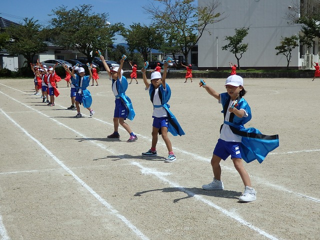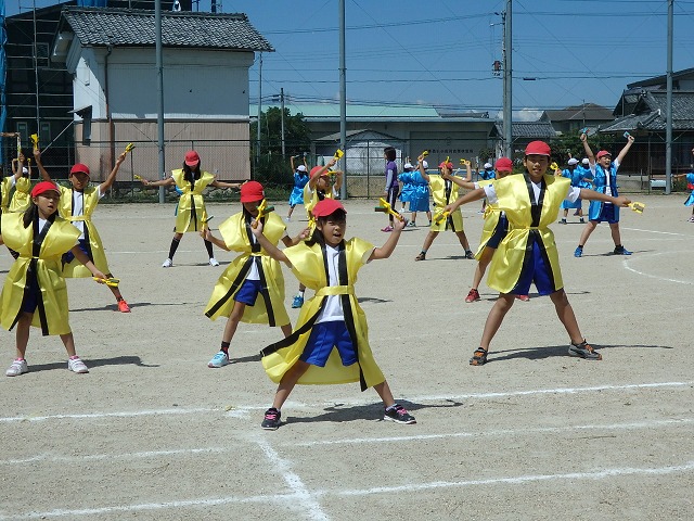 中学年は、「ドッコイショ、ドッコイショ ソーラン、ソーラン」元気なかけ声とともに3・4年生64名が運動場いっぱいに力強く踊ります。