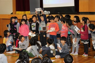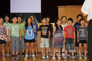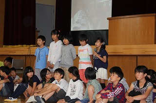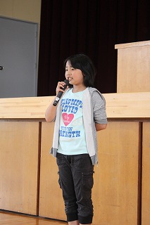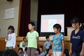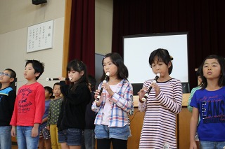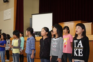 その後、続いて、四年生から歌「生きているびわ湖」の発表、六年生からは修学旅行の思い出をスライドで報告してくれました