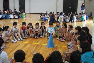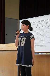 集会では、児童会本部委員長の山川留奈さんの始めの言葉に続いて、全校みんなで『はじめの一歩』を歌って始まりました。まずはじめに、今年の色別リーダーと班長が自己紹介し、決意を述べました。続いて、色別班ごとに集まって、自己紹介を行って、班の仲間の名前を覚えました。その後、色別対抗でゲームを楽しみながら、交流を深めました。最後に、児童会本部副委員長の西川咲帆さんが閉会の言葉で、集会を終えました。