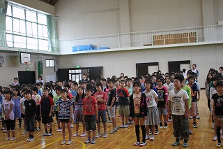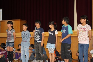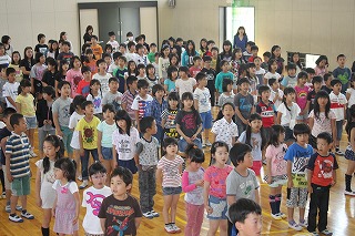 今年から全校の子どもたちが一同に会して、全校で歌ったり、各学年の発表を見学したり、各委員会の活動を紹介したりする場として、年三回の全校集会の開催を計画しています。その第一回目の全校集会を去る6月8日月曜日に体育館で行いました。
