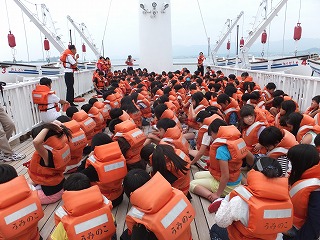 その間、船内で、他の乗船校の人たちと開校式に続いて、オリエンテェーション・避難訓練を行い、食堂で昼食をとりました。