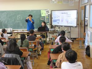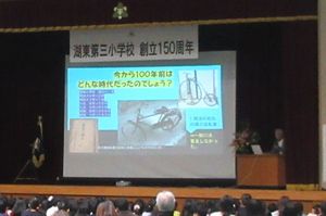 午前中の集会では地域コーディネーターから湖東第三小学校の歴史についてお話を聞いたり、湖東第三小学校クイズをしたりして、湖東第三小学校の歴史と伝統の重みを感じ、未来の湖東第三小学校に思いを馳せました。