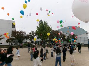 集会の最後は、未来への願いを込めて6年生のカウントダウンで一斉に風船を空に飛ばしました。