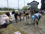雨のため予定より一週間延び、この日も少し肌寒さを感じる気温ではありましたが、ようやく田植えをすることができました。5年生の子どもたちは、慣れない田んぼの作業でしたが、たくさんの方にご指導をいただきながら、泥だらけになって苗を植えていきました。