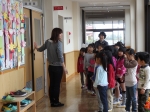 1年生は、小学校を探検したり、教室で机に向かって字の練習をしたり、