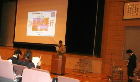 修学旅行では旅行社の方から映像を交えて沖縄の行程やねらいを教えていただきました。