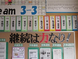 学校生活が再開し、教室も日を追うごとに賑やかになってきて、生徒の活動の足跡が見られるようになってきました。学級目標を掲示したり、生徒の作品や通信などを掲示するなど、それぞれの学級で工夫しながら学習環境が整ってきています。