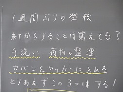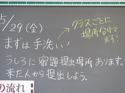 いよいよ来週からは学校再開です。新しい学校生活に向けて、安心で安全な学校生活を送るために、登校時間を分けて2時間の学活を行いました。感染症対策の注意や学級の係決め、提出物の回収などが主な内容です。「おはようございます!」「さようなら!」と元気よくあいさつしてくれる子どもたち。職員一同、緊張感を持ちながらも明るいトーンでがんばります!
