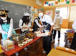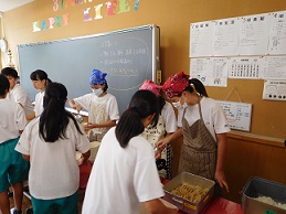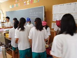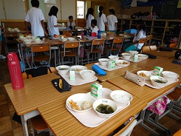 2学期の給食も火曜日から始まり、1学期同様に準備から食事、後片付けまで学級で協力してできています。衛生面を重視して、給食当番が配膳する際には、三角巾とマスク、エプロンを着用しています。3学年ともこのルールをきちんと守りながらおいしくいただいています。給食の時間には、机を合わせて楽しそうに食事をしている子どもたちの声が教室から聞こえてきます。これも、湖東中学校の日常の一コマです。