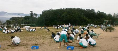 8月24日(日)は1週間延びた全校親子除草作業が行われました。校舎周りやグラウンド、テニスコート周辺を一生懸命に作業しました。