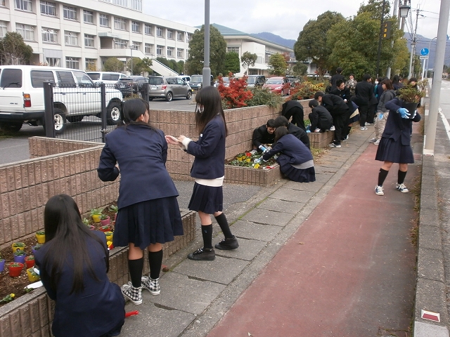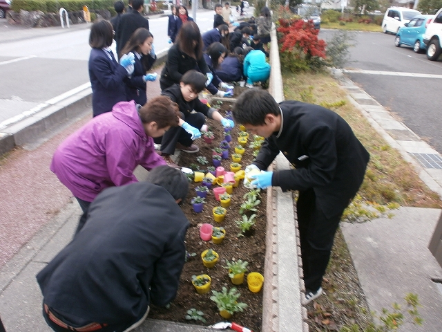 今回は生徒(生徒会・環境ボランティア委員・学級委員・有志)と教員の併せて45名で花植を行いました。