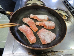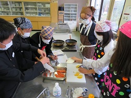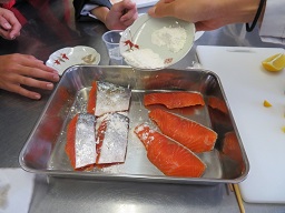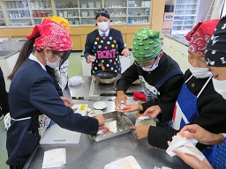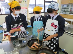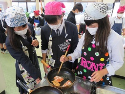 2年生の家庭科の授業で調理実習がありました。エプロンやマスクを着用して衛生面の指導を受けたあと、グループごとに「鮭のムニエル」づくりに挑戦しました。男女が協力しあいながら、和やかな雰囲気で実習ができたようです。お家でも学習の成果を発揮して食事づくりのお手伝いをしてほしいものです。