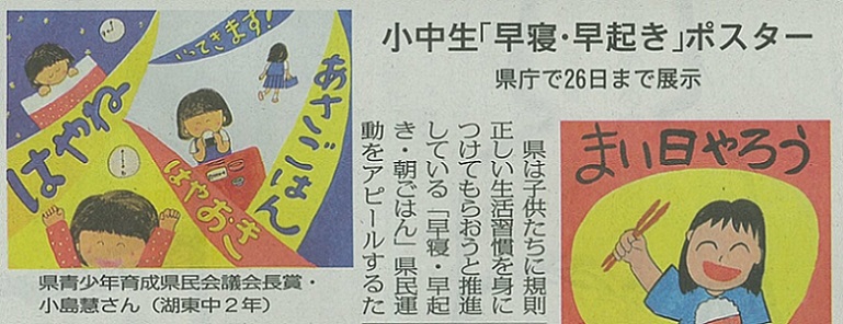 滋賀県の「早寝・早起き・朝ごはん」県民運動アピールのためのポスターコンクールで、湖東中学校の小島慧さんの作品が入賞しました。「県青少年育成県民会議会長賞」を受賞。おめでとうございます!なお、作品は県庁で26日まで展示されているそうです。