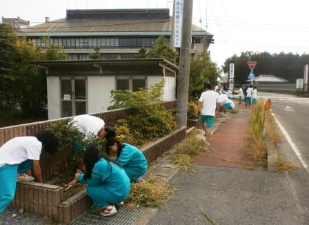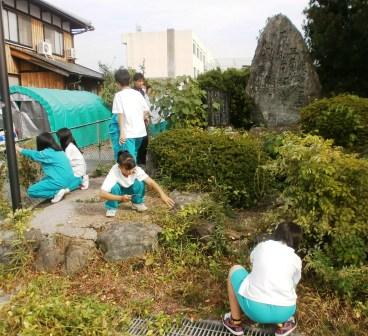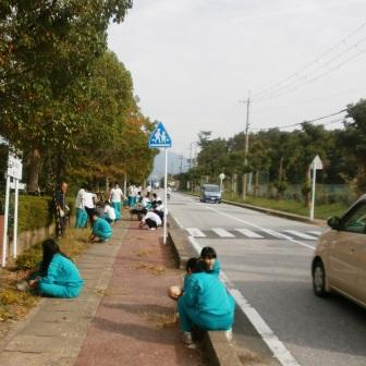 自動車が通って危険ではありましたが、校舎周りの歩道や三角野(みすまの)の石碑周りも作業しました。