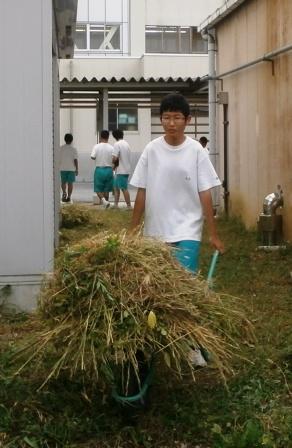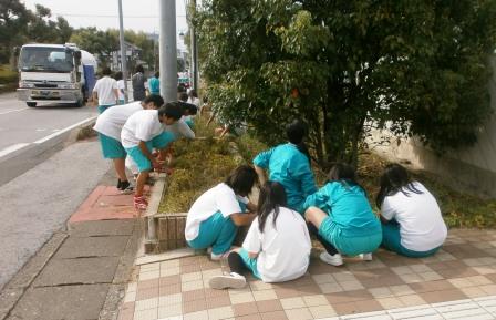 10月4日、校庭はキンモクセイの甘い香りが漂っていますが、校舎の周りは大分雑草が生い茂ってきました。そこで6時間目は全校除草作業が行われました。
