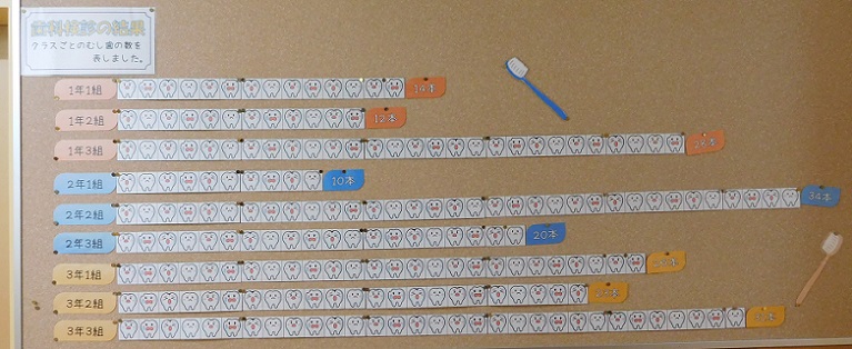 保健室前には先日の歯科検診の結果が掲示されています。学級ごとの「むし歯」の数が表されており、最も多い学級で34本、最も少ない学級で10本でした。歯の手入れをしっかりして、いつまでも大切にしてほしいと思います。