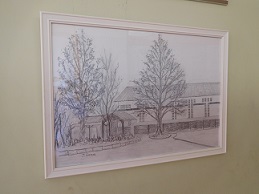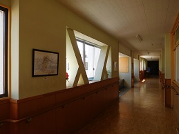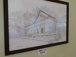 2階の職員室から3年生の教室前ろうかには、校長先生の絵画が展示されています。建物や町の風景など、いろんな絵が並びます。湖東三山「西明寺」など湖東地域を描いたものもあります。生徒には大変好評で、新しい作品を期待する声が聞かれます。来校された際には、ぜひご覧ください。