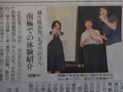 湖東地区の探検の殿堂が開催中の企画展「南極の技術60年の創造力」に合わせて、女性記者として初めて南極地域観測隊に同行、越冬を体験した中山由美さんが湖東中学校で講演してくださいました。多くの画像や動画を交えながらわかりやすくお話をしていただき、探検の殿堂で職場体験をした2年生もお手伝いさせていただきました。南極の氷の披露もあり、貴重な学習の機会となりました。講演の様子は17日発行の中日新聞に掲載されました。
