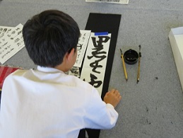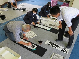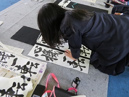 国語の授業で書写の作品作りに取り組んでいます。特に3年生では、辰巳三喜雄先生をお招きして指導していただきました。学校の特別教室「書写室」で書写の授業は行われます。お手本を見ながら真剣に取り組む生徒の姿。真剣に取り組むこの姿が、心の成長につながるのだと思います。選ばれた作品は、展覧会等に出品されます。