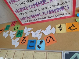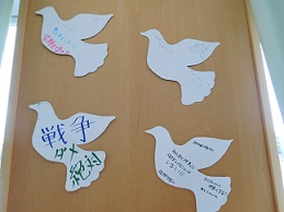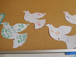 5月3日は憲法記念日。湖東中学校では、3年間を通して日本国憲法について学びます。3年生では、日本国憲法の三大原則の一つである「平和主義」について学びました。平和の象徴である鳩をかたどったものに、「他の国と協力して困っていることがあれば助ける」や「一人ひとりが大切にされるような世の中に」「戦争という言葉をなくす」「みんなと仲良くし、人を傷つけることはしない」など、一人ひとりが思いを込めたメッセージを書き、それぞれの学級で大切に掲示してあります。