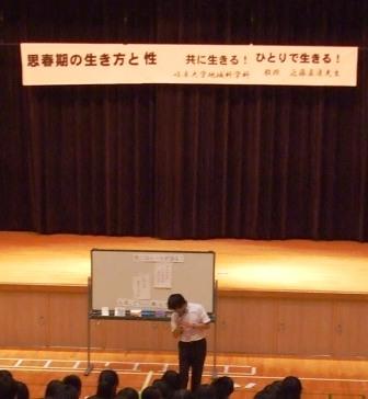 演題は「思春期の生き方と性」です。難しそうなタイトルですが、先生はポンポンとテンポよく巧みな話術でユーモアたっぷりに、中学生の男女交際や受験勉強についてわかりやすく教えていただきました。