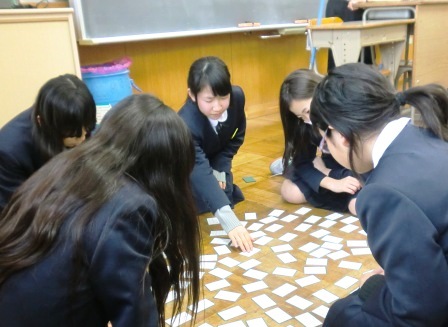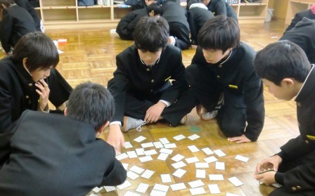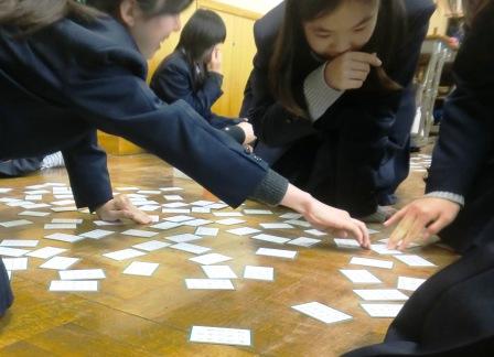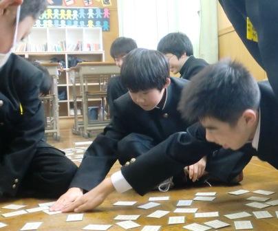 お正月の雰囲気もかすかに残っている中、1年生は8日の学活の時間を利用して、学級対抗百人一首カルタ取り大会を開きました。
