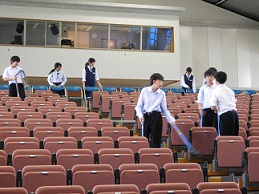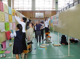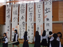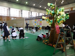 いよいよ明日は文化祭!この日の午後は前日準備です。多くの生徒たちが担当として活動し、会場となる体育館の準備を頑張ってくれました。観客席の準備や垂れ幕、展示物などの準備に走り回っていました。会場の外では、吹奏楽部や和太鼓、有志発表の練習に励む生徒のたちの姿も見られました。明日の文化祭が子どもたちにとって最高の思い出となることを願います。