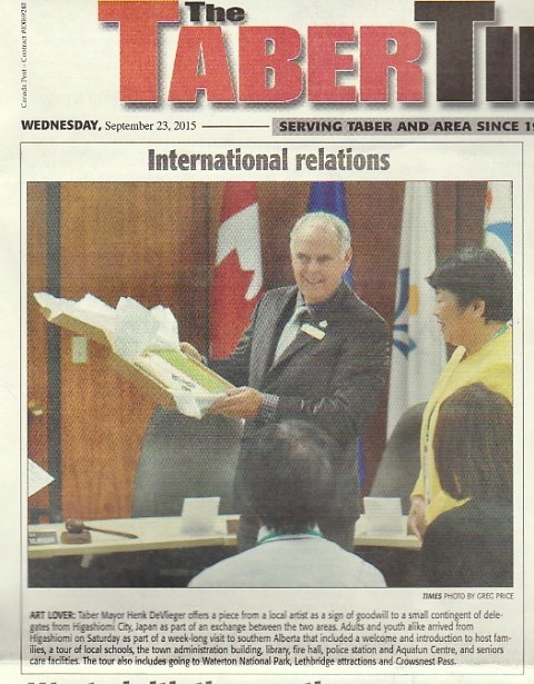 上の地元新聞紙の写真は、歓迎会でテーバー町長さんから記念品を授かっているところです。(黄色のジャケットが教頭先生) 友好親善使節団は9月19日(土)に出発して、ホームステイをしながら7日間地元中学校や美術館、国立公園などを訪れて親善交流を図ってきました。そして、9月26日(土)に全員元気に帰国しました。また、テーバーでの活躍ぶりが近々報告される予定です。