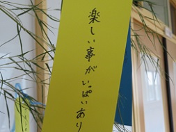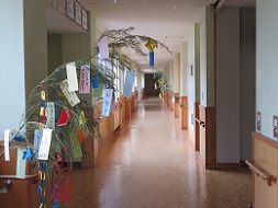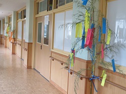 2階廊下には笹がおいてあります。七夕に向けて、子どもたちや職員が願いごとを書いたり、飾りつけをしています。新型コロナウイルス感染症により、不安なことも多い毎日ですが、明るい未来に向けていろいろな願い事が書かれています。学校再開から元気に頑張っている子どもたちです。きっと願いは叶うことでしょう。