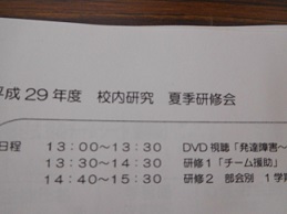 17日(木)、湖東中学校全職員による校内研修会を行いました。これまでから、様々なテーマで研修を重ねていますが、今回のテーマは「発達障害」です。それぞれの課題に対応した支援のあり方について学び、2学期からの子どもたちへの関わりについて考えました。学年ごとの話し合いでは担任を中心に熱心に語り合いました。その後、「授業づくり」「仲間づくり」「環境づくり」についてそれぞれの部会で話し合い、2学期からの教育活動について確認し合いました。まもなく2学期が始まり、子どもたちを迎えます。充実した2学期になるように職員一同がんばります。