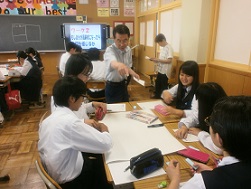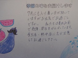 先日、3年生が総合的な学習の一環で、「お弁当を包む絵手紙作り」に取り組みました。湖東地区社会福祉協議会が実施している「季節の味お届けサービス」に関わらせていただき、地域のこと、自分たちが考えなければいけないことを見つめ、福祉について学ぶ機会となっています。詳しくは、「さざんかNO.13」をご覧ください。