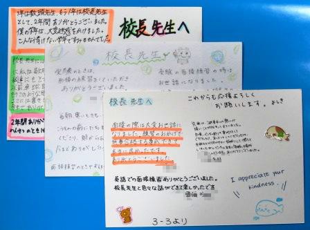 3月4日、いよいよ明日は高校一般入試という日に、三年生の各クラスからメッセージカードをいただきました。お世話になった全部の先生に配っているようでした。